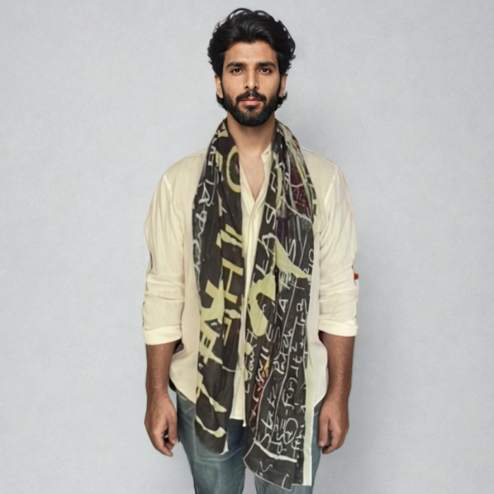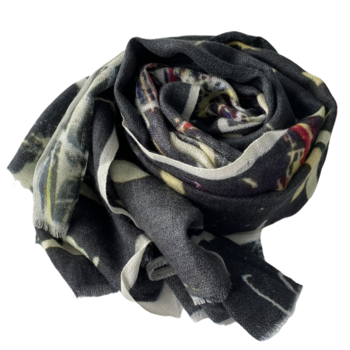 Introducing "Atlas," a lightweight cashmere scarf perfect for any season. This unisex scarf, designed by artist Steve Miller, features elements from CERN's "Journey to the Heart of Matter: The ATLAS Project." Inspired by his time with CERN scientists, Miller pays homage to their quest to understand the origins of the universe. Wrap yourself in luxury and science with this unique, stylish accessory.
