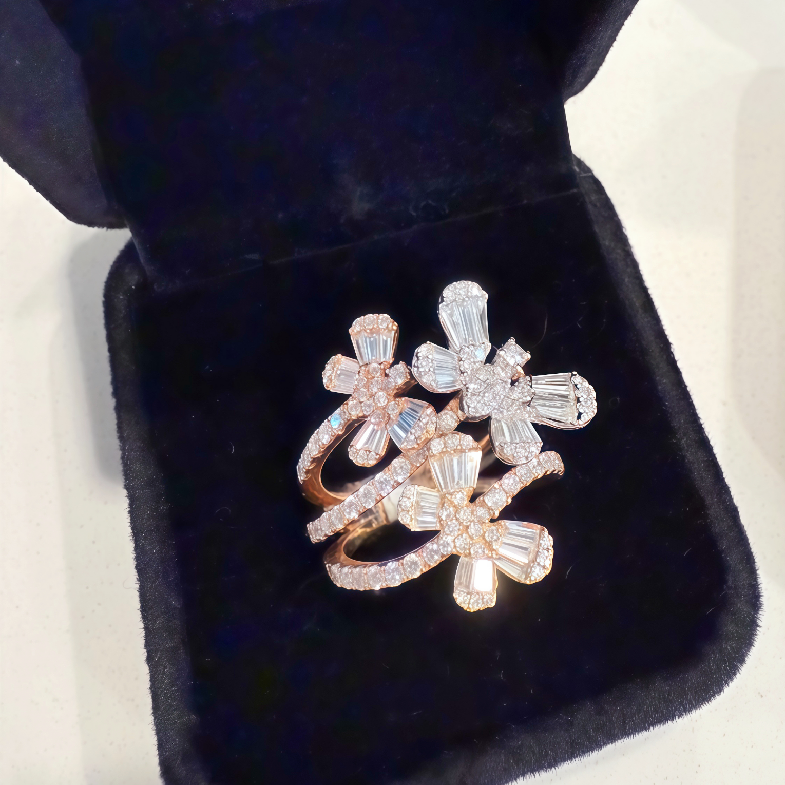 The wings feature a sophisticated mix of baguette and round diamonds, creating depth, movement, and couture-level sparkle from every angle. The pavé-set band enhances the overall radiance while offering a comfortable, luxurious fit that feels as beautiful as it looks.