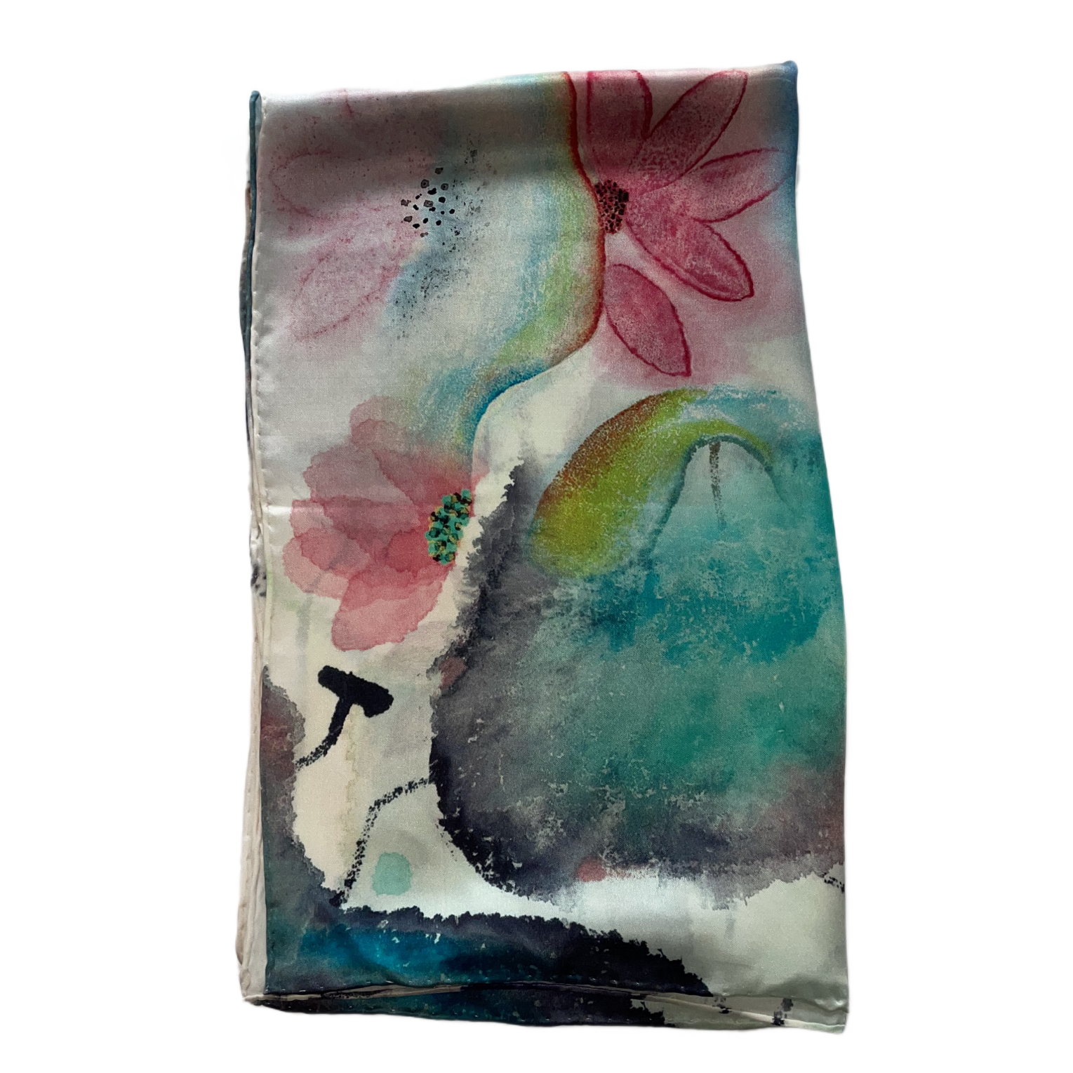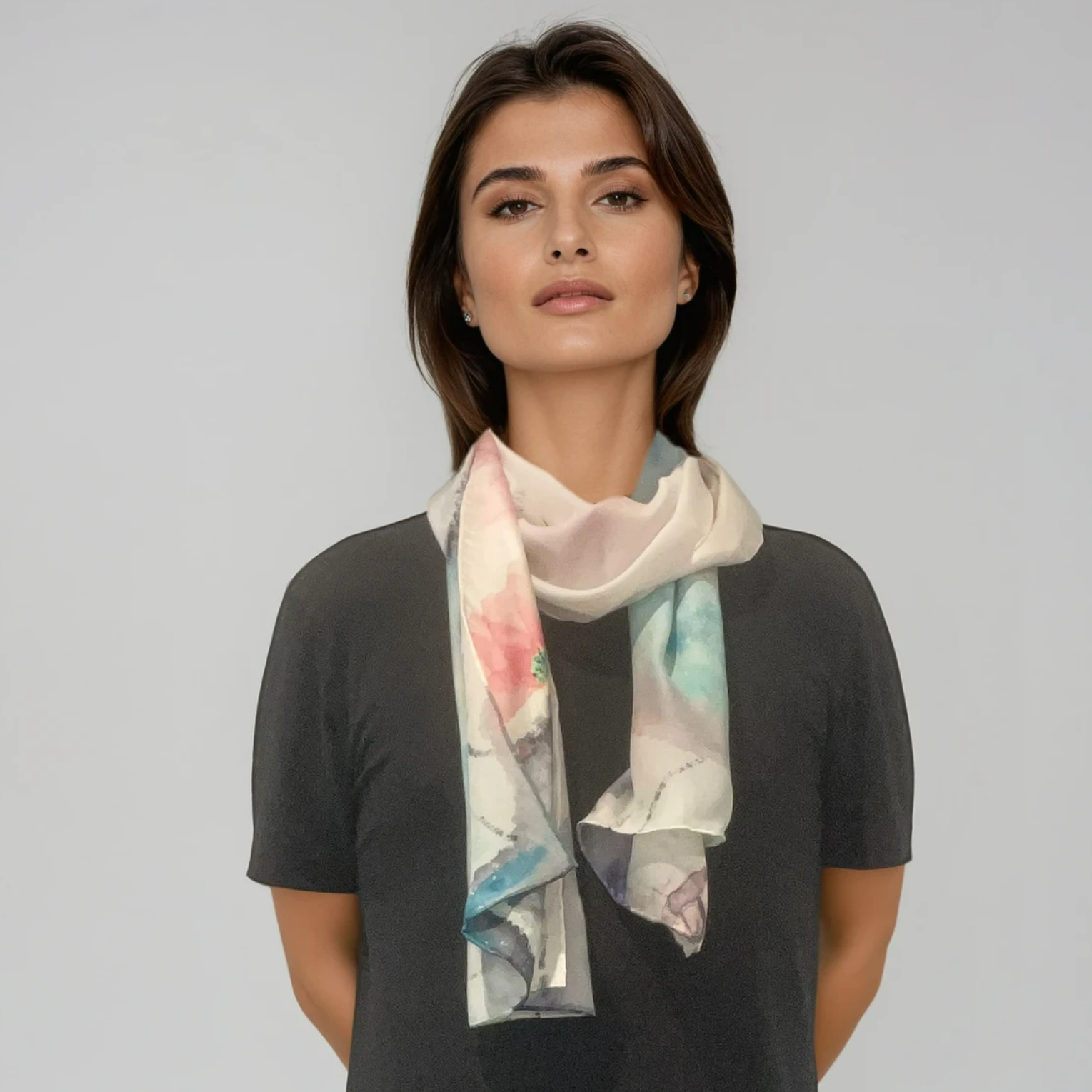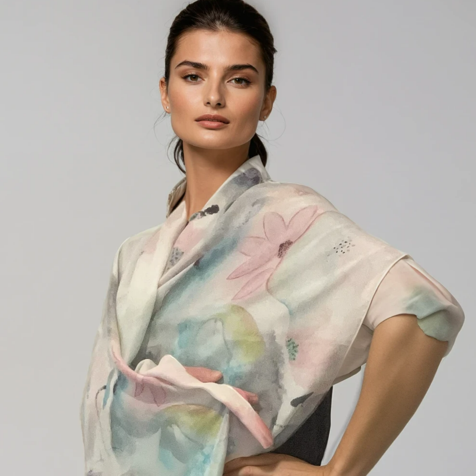 The Fleur Scarf captures the softness of watercolor florals in bloom. Delicate pastel flowers drift across an off-white background, creating an airy design that feels both romantic and timeless.