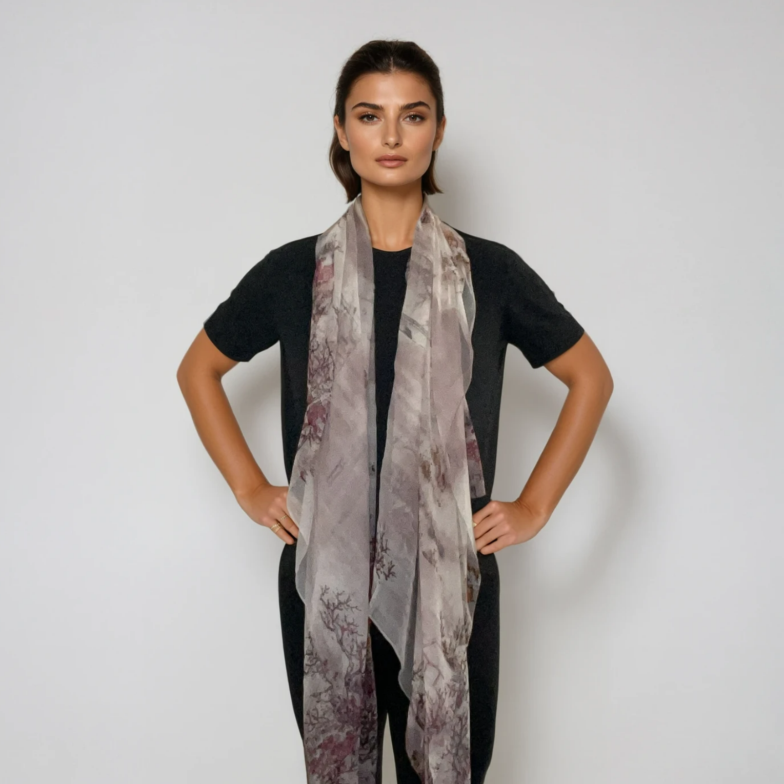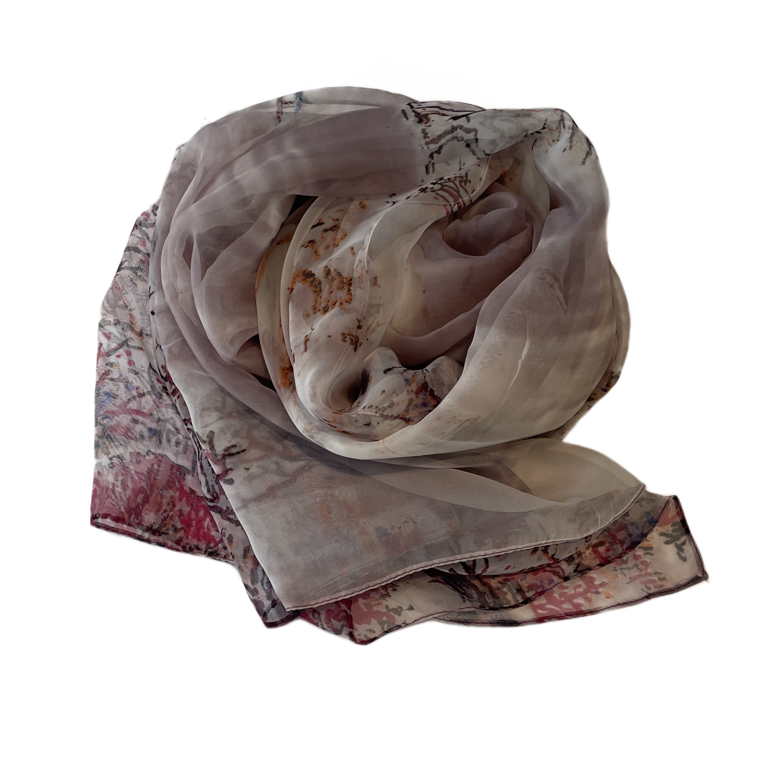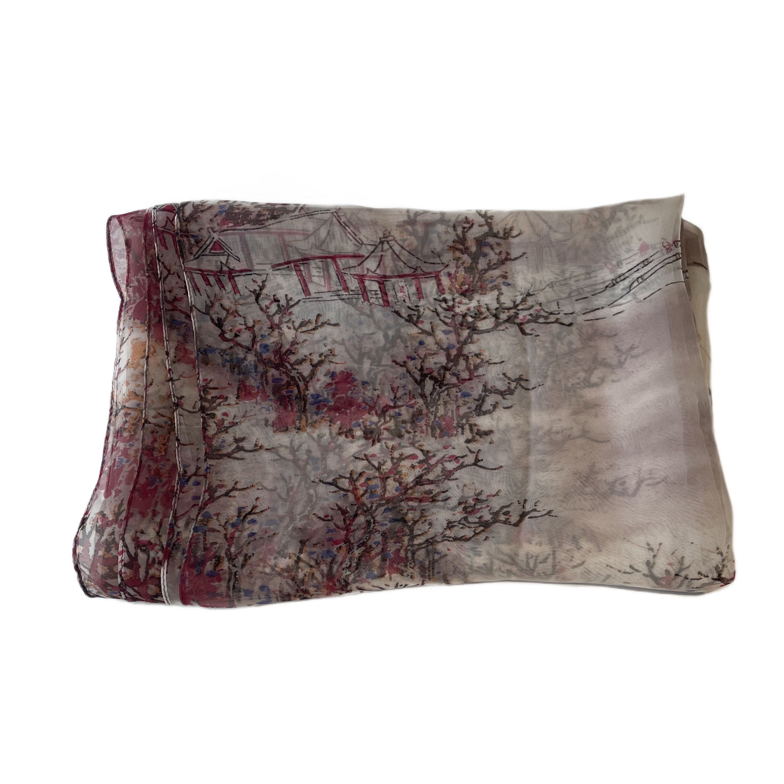 Soft, romantic, and effortlessly versatile, Hanae is a lightweight silk-polyester blend scarf designed to move beautifully from city to seaside. The scarf features an Asian-inspired pastoral scene set against a pale pink base, creating a sense of calm elegance and quiet storytelling.