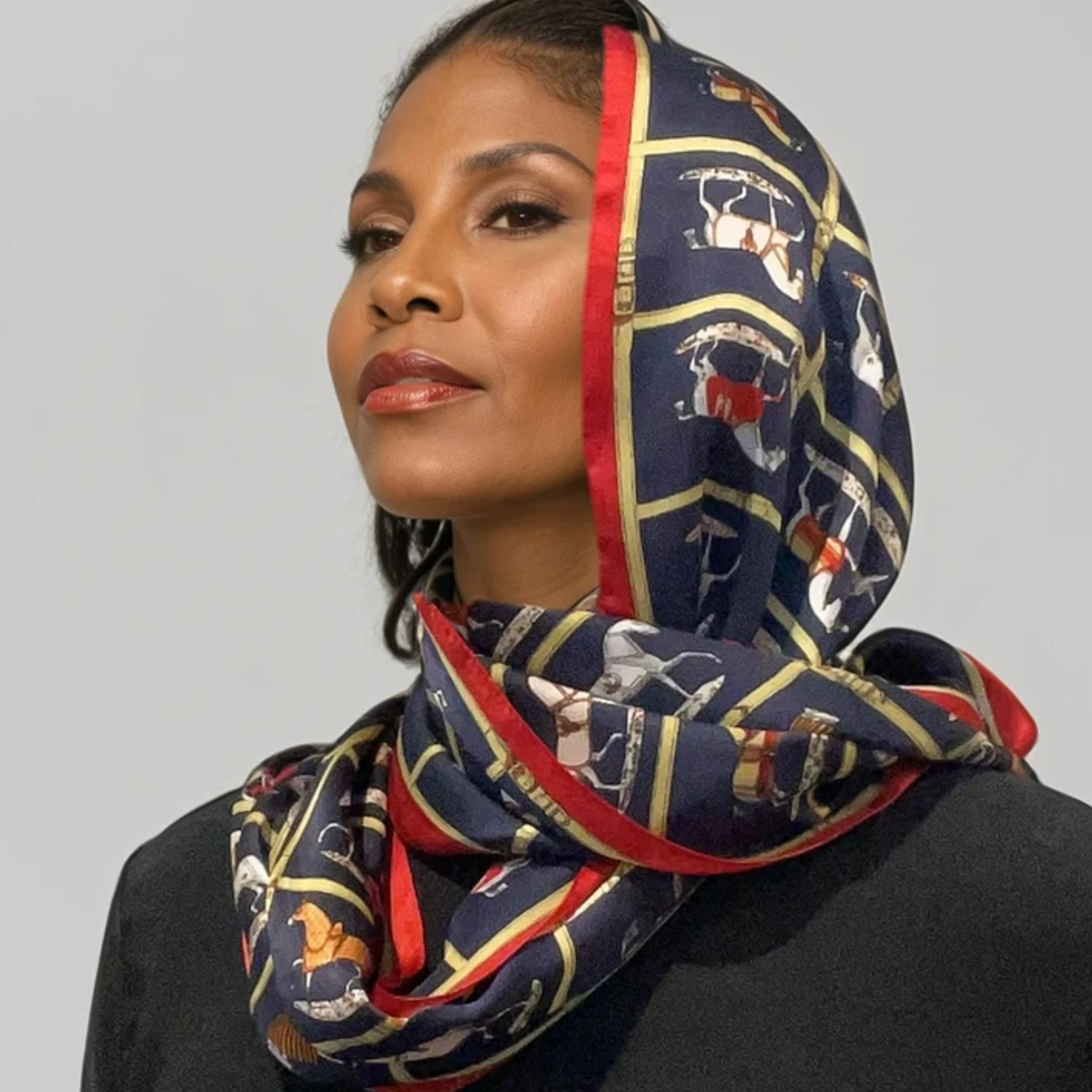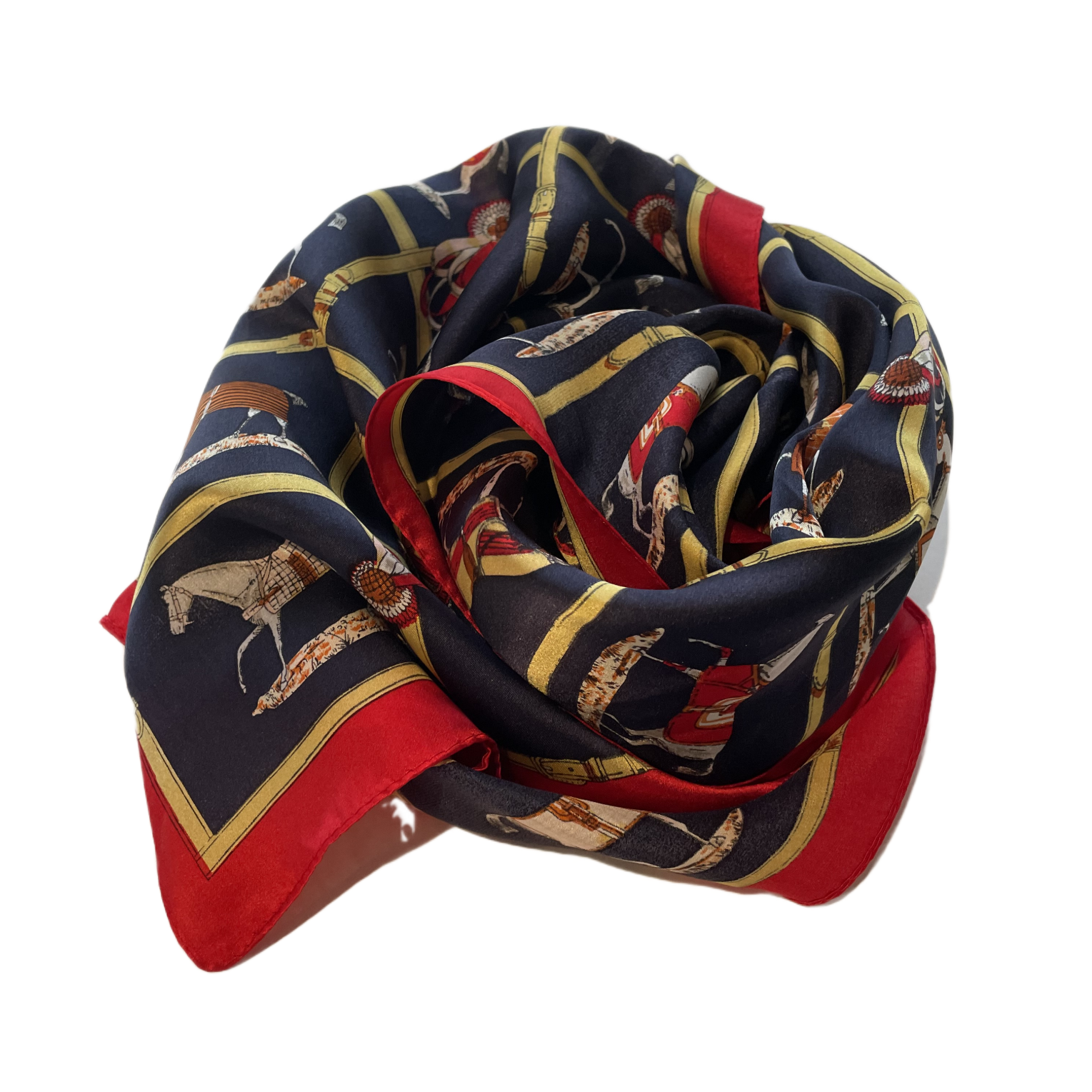 Crafted from 100% pure silk, the Jacinthe Scarf is a study in refined equestrian elegance. The scarf features 115 panels, each adorned with an Hermes-inspired horse in an ornamental cloth set against a deep navy background. A contrasting red border frames the design, while the stitched rolled edges ensure a polished finish. Lightweight yet luxurious, this scarf drapes beautifully and elevates any outfit, making it perfect for day-to-night wear.