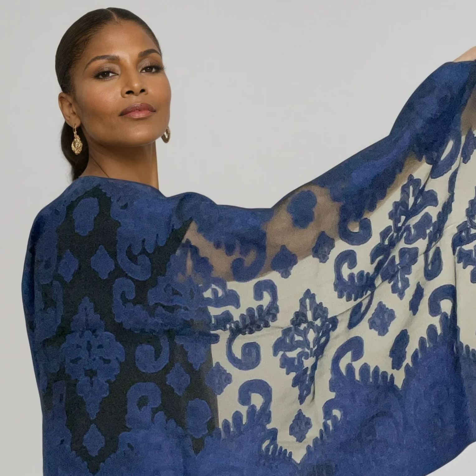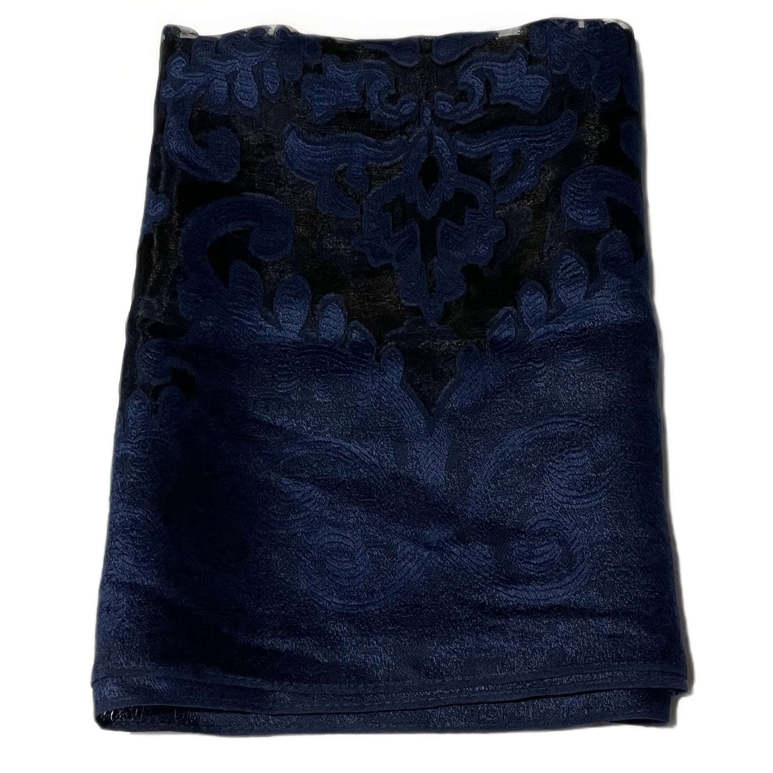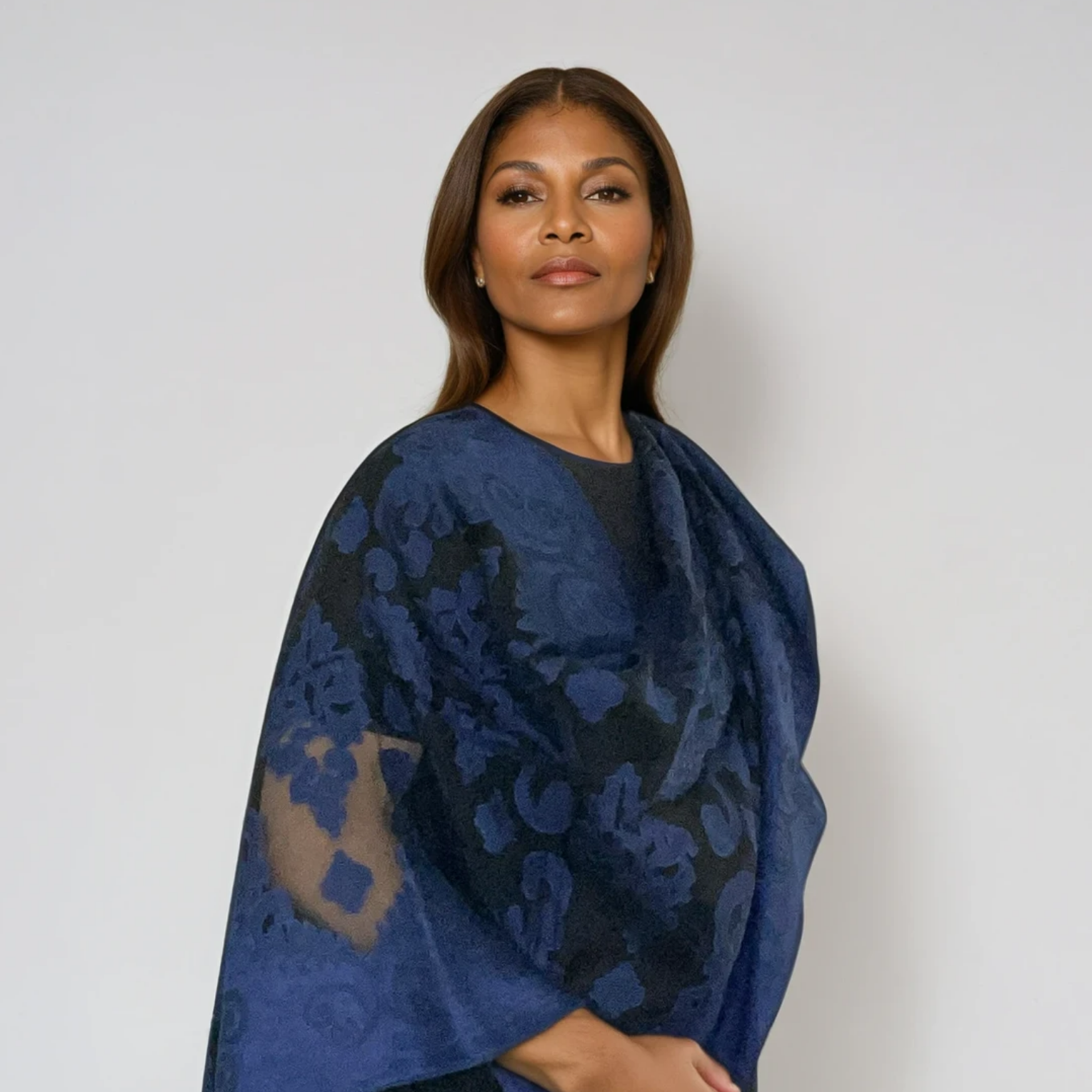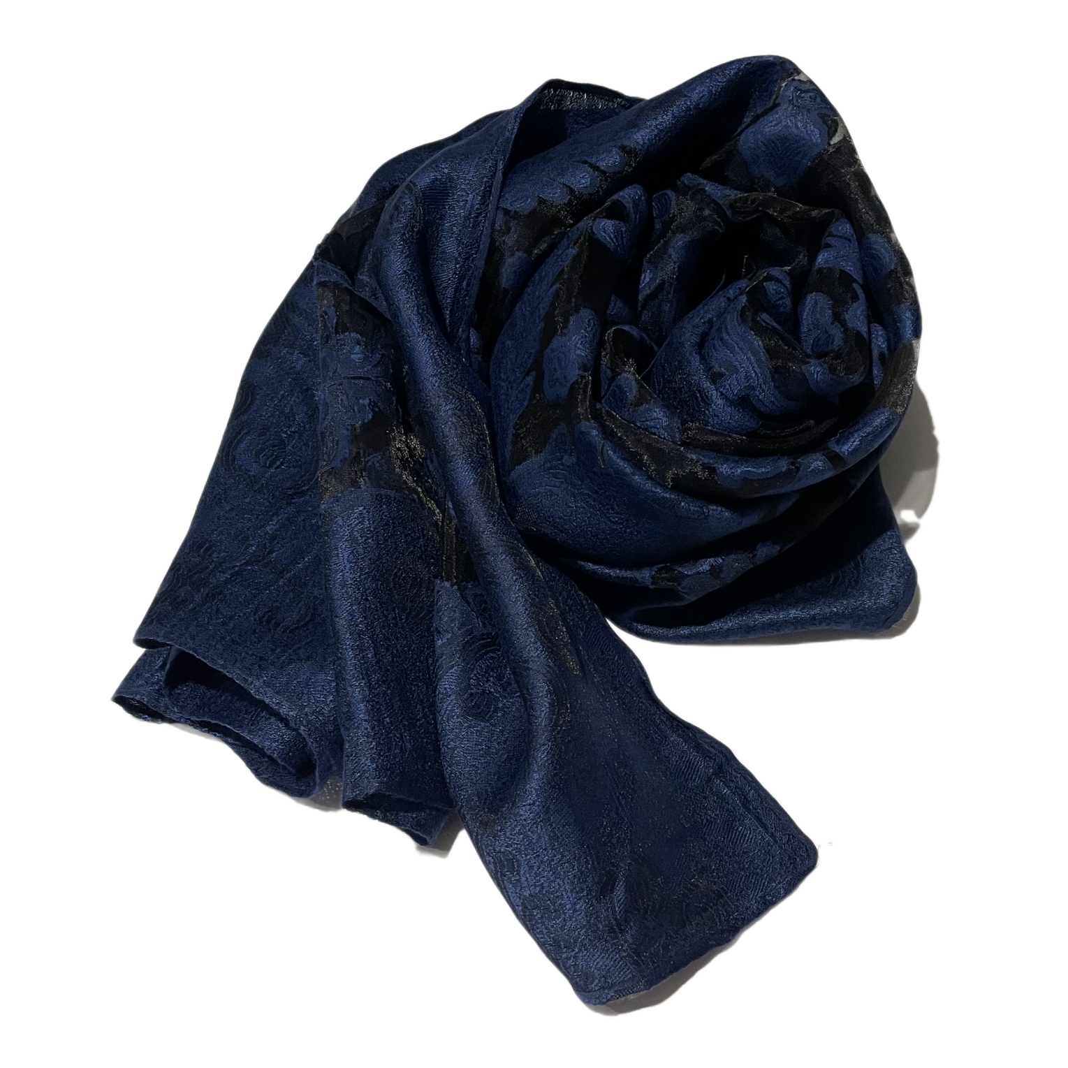 Kalista is a study in elegance and craftsmanship. Made from 100% Thai silk, this lightweight scarf pairs a rich deep blue silk base with sheer black organza, creating depth and movement with every wear. Intricately embroidered paisley motifs trace the surface, adding texture and a refined, ornamental finish.