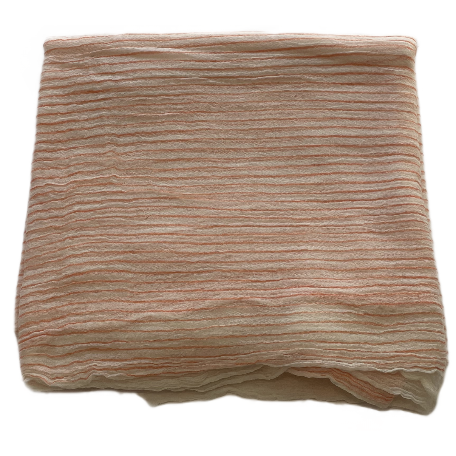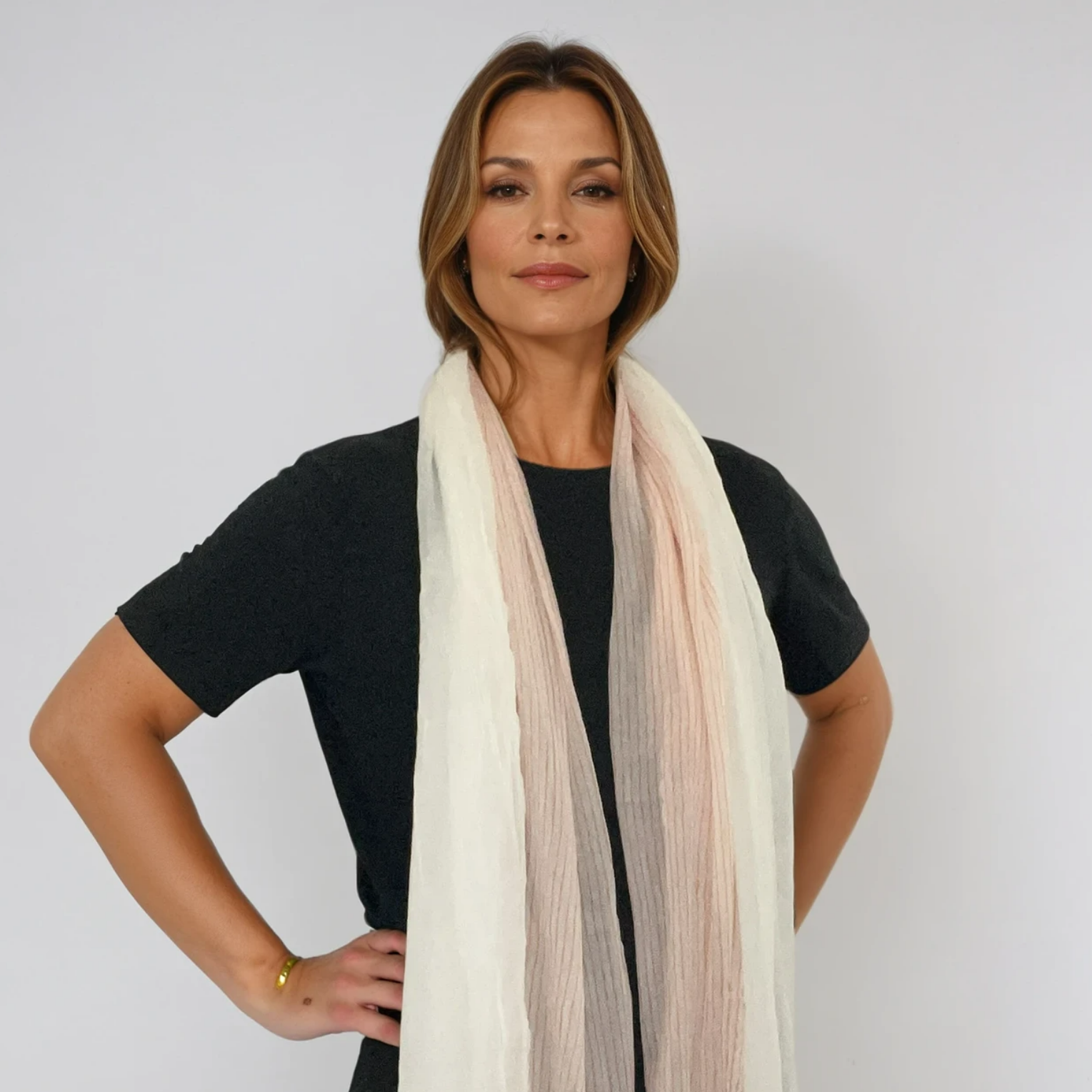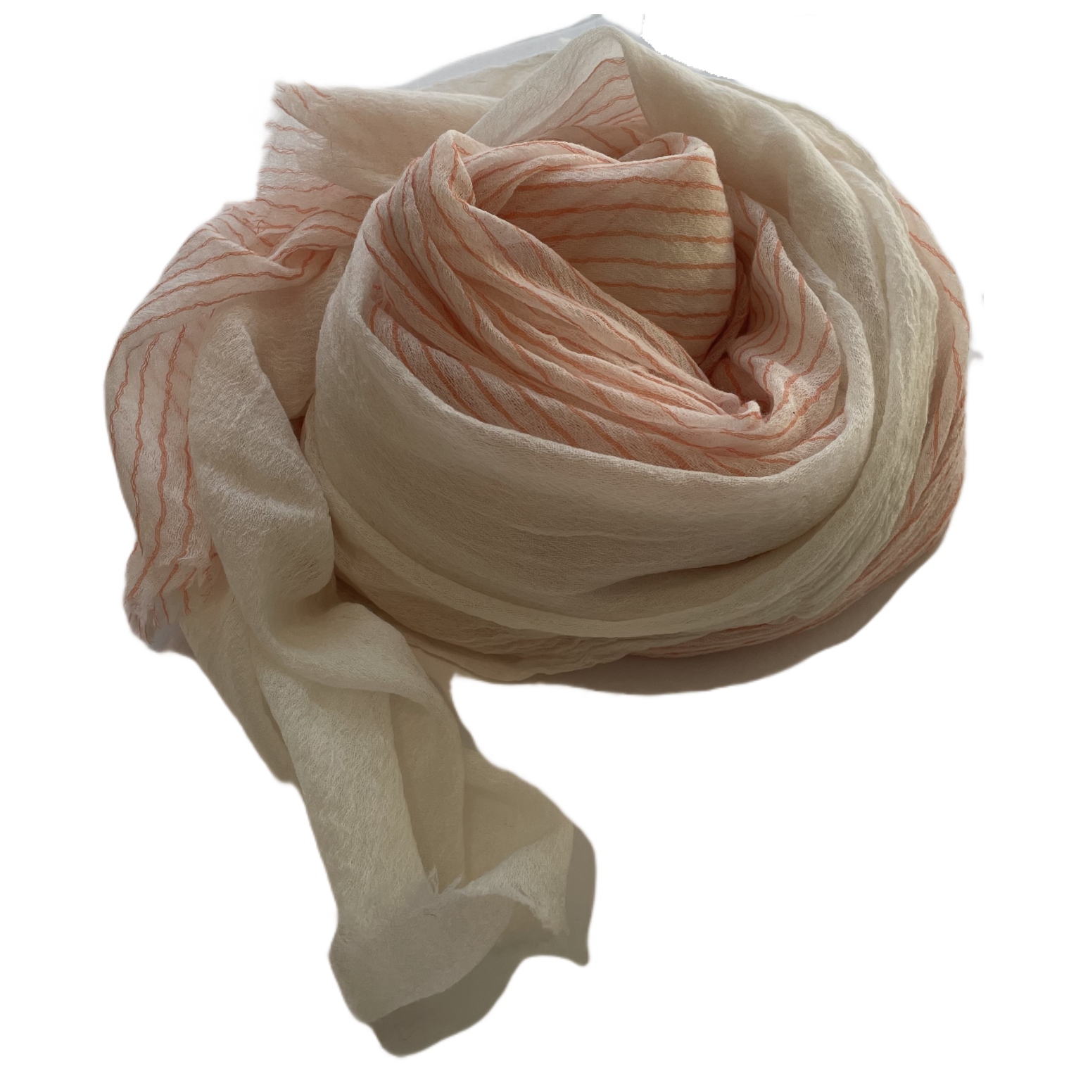 Thea is a study in quiet elegance. Crafted from 100% lightweight cashmere, this scarf features a balanced design with one half in crisp solid white and the other in delicate light-orange striping on a white ground. The contrast is subtle and refined, adding interest without overwhelming the look.