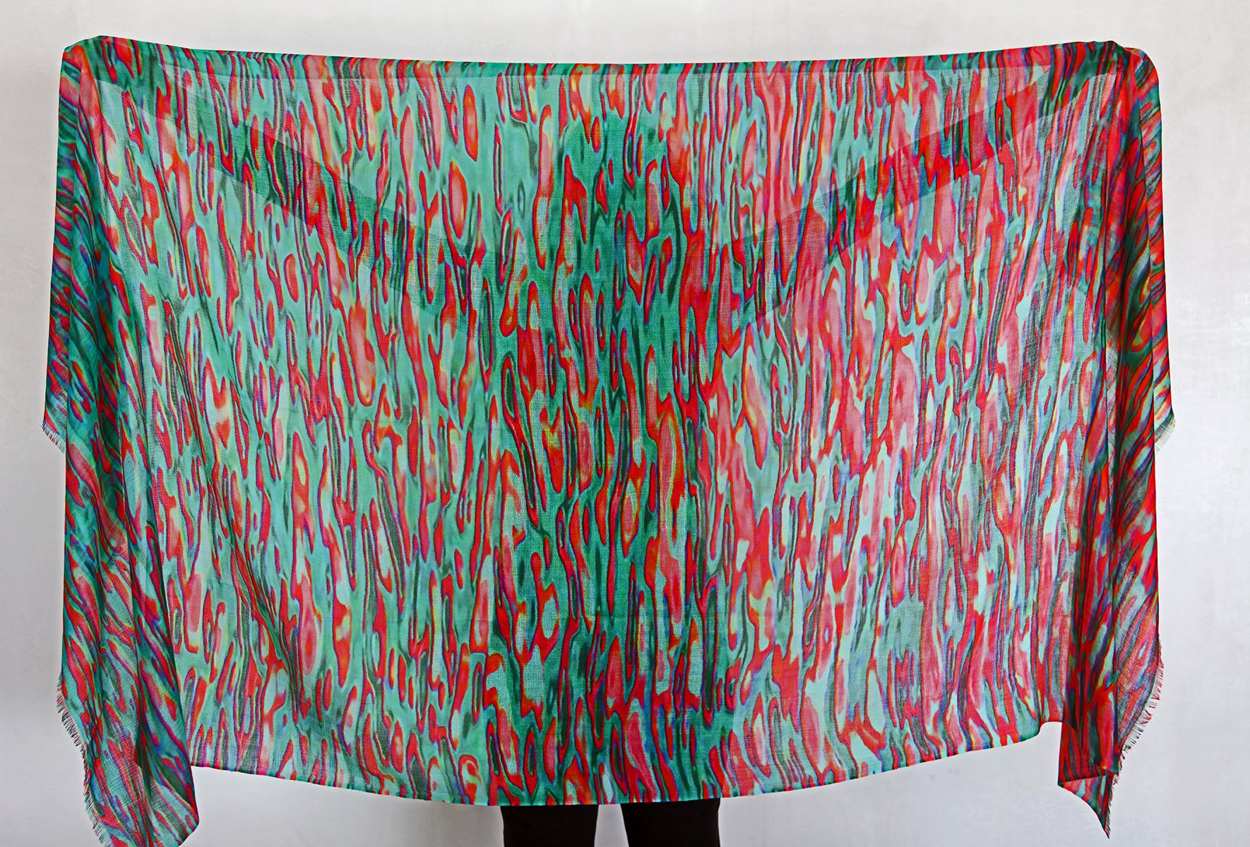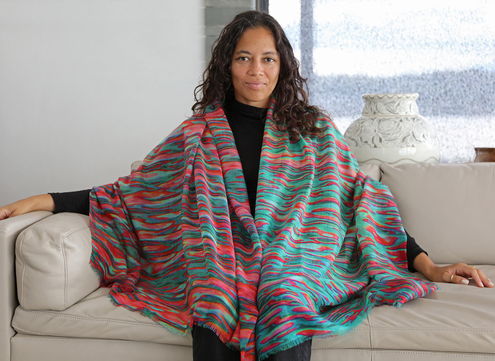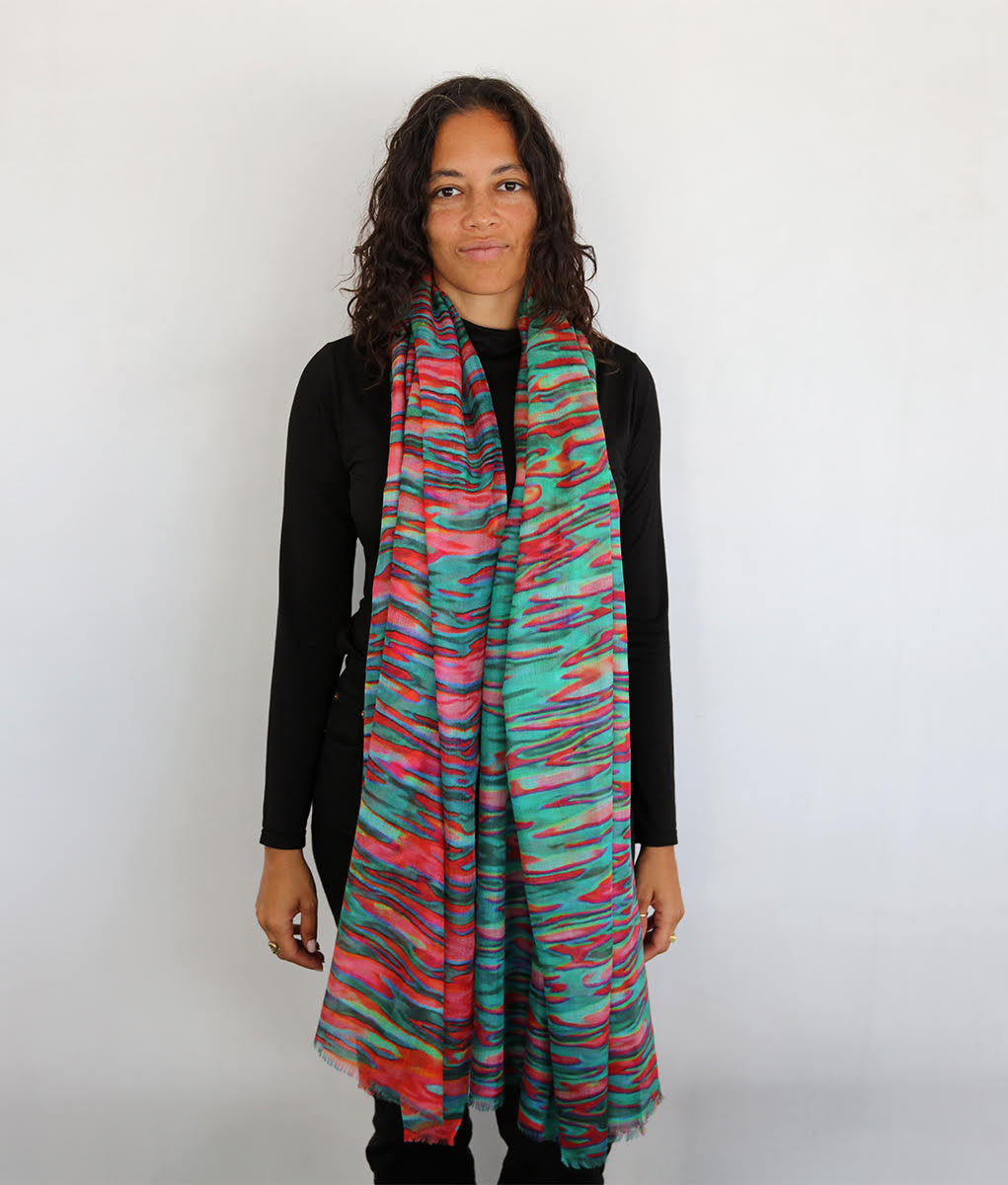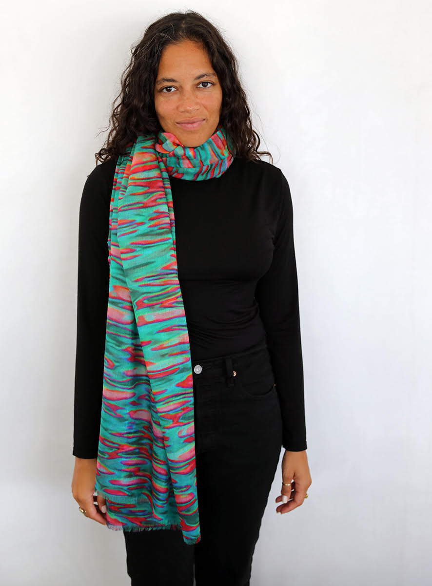 Introducing 'Mood Changer', a 100% Cashmere scarf by artist Carolyn Marks Blackwood. It showcases a captivating blend of colors, inspired by the patterns on the river near her home. Ideal for those who seek to add a touch of nature's beauty to their wardrobe.
