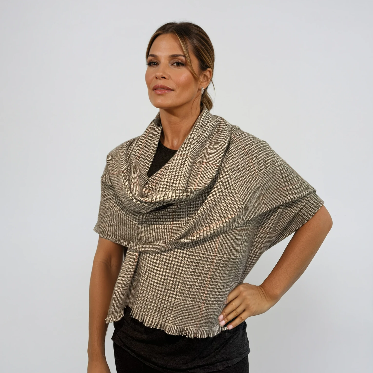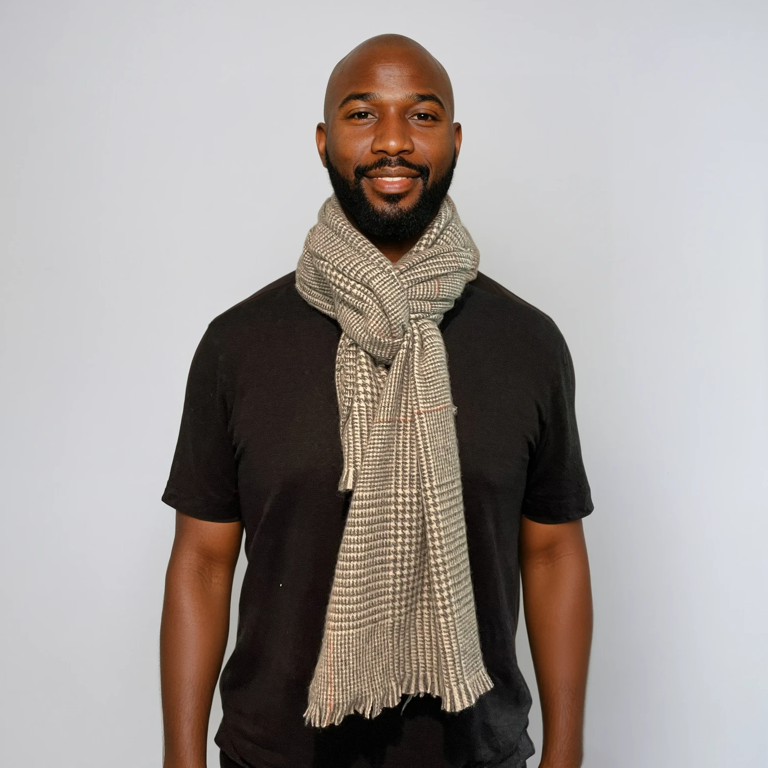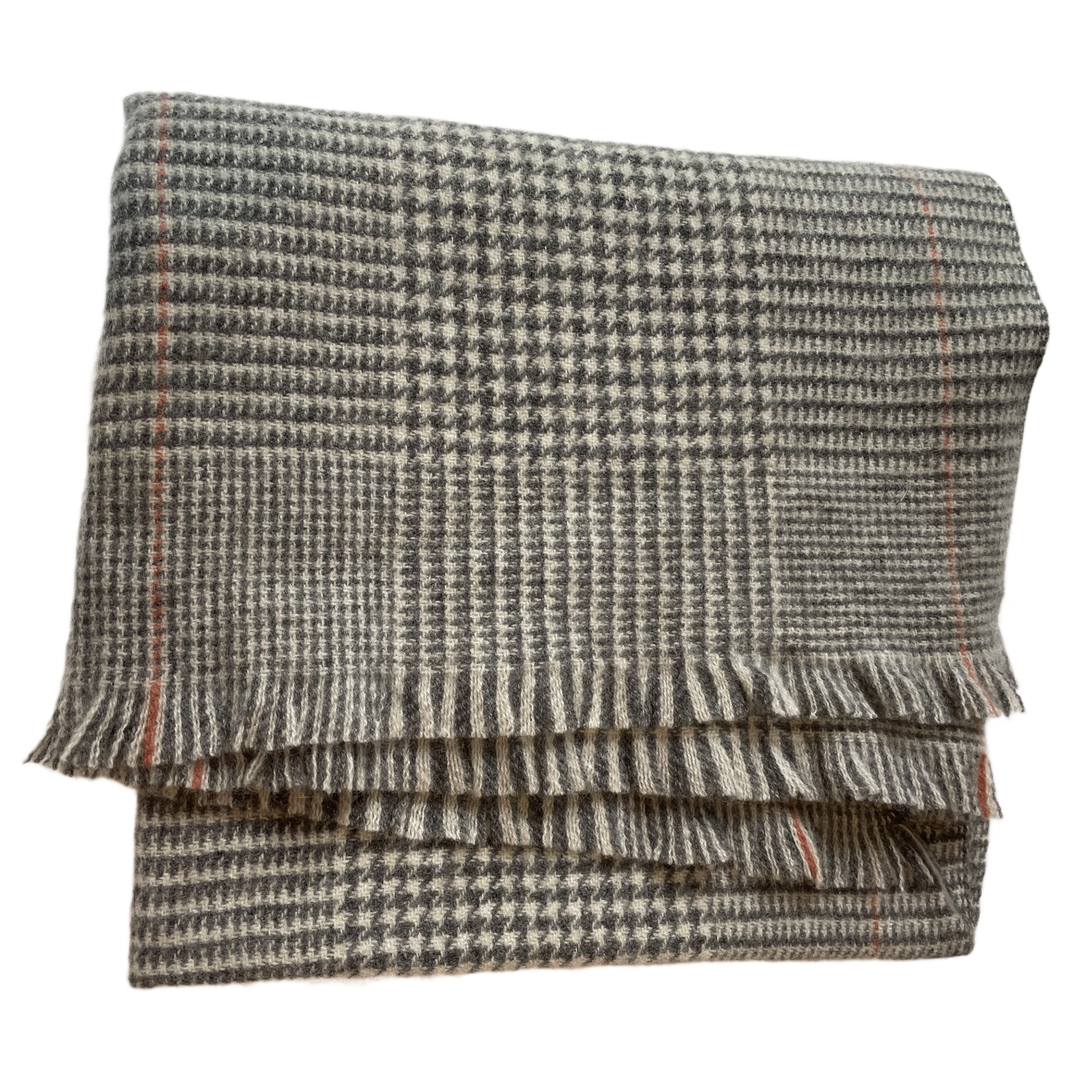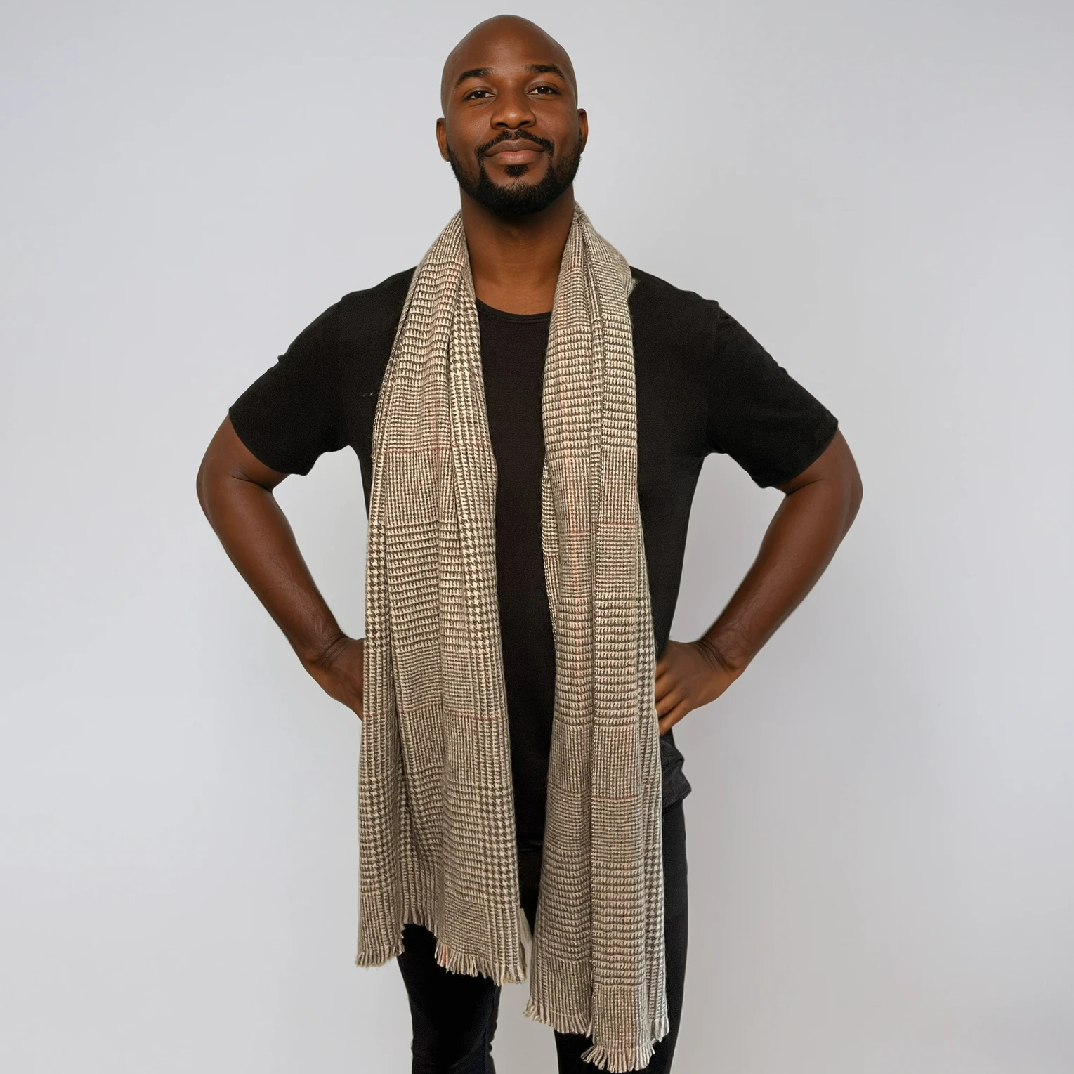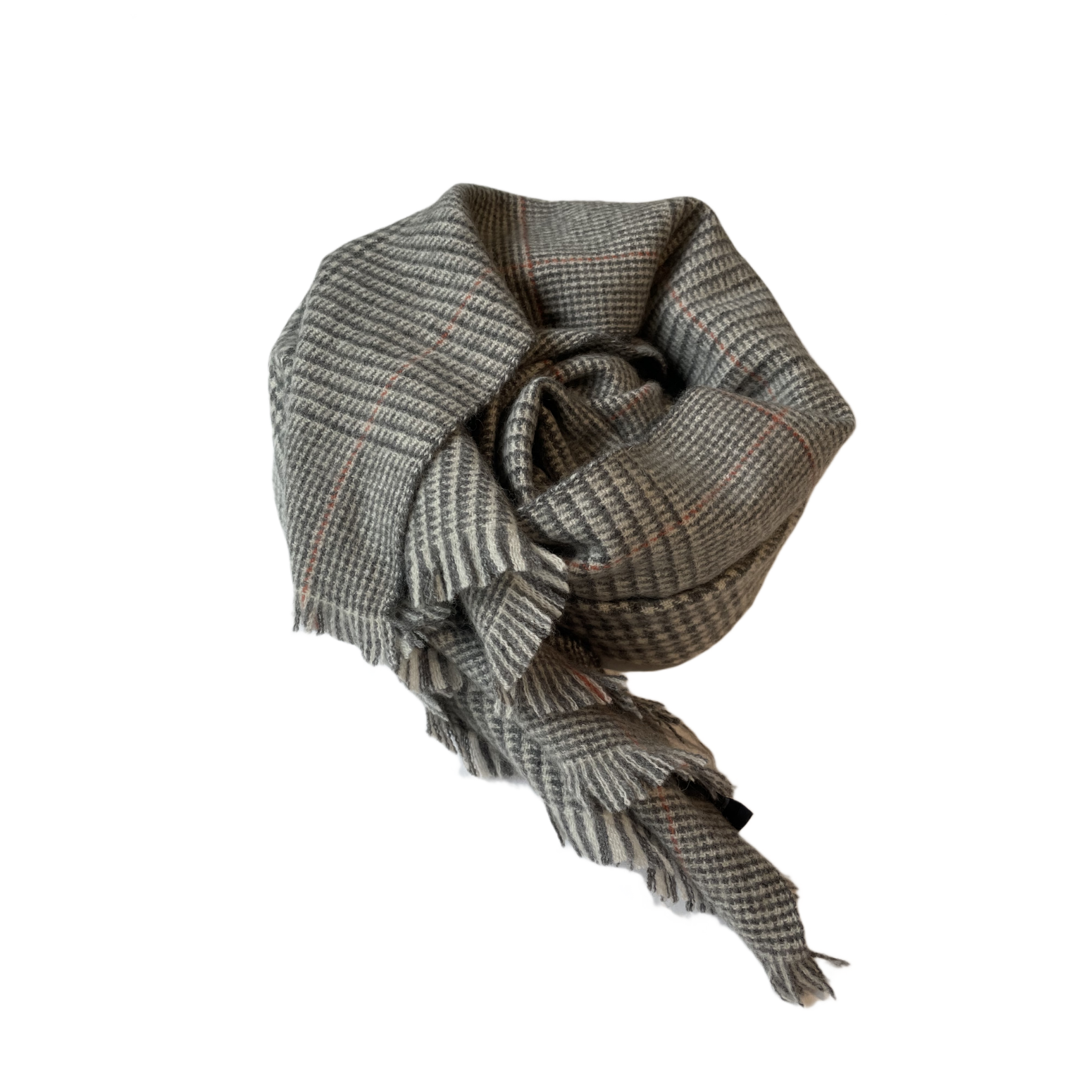 Wrap yourself in timeless elegance with the Orion scarf. Crafted from 100% cashmere, this medium-weight piece offers exceptional warmth and softness. Its refined houndstooth-inspired pattern in black, cream, and grey is accented with subtle rust-orange lines, adding a modern touch to a classic design. Finished with a delicate fringe, Orion is a versatile accessory that works effortlessly from weekday to weekend, making it an essential for both men and women.