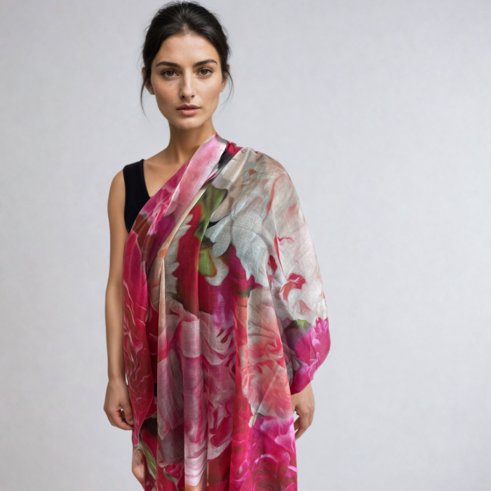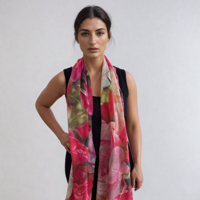 "Peonies" is a 100% cashmere scarf that brings a touch of elegance to any outfit. Lightweight and perfect for any season, this scarf combines luxury with artistic flair. The artist, Carolyn Marks Blackwood, has beautifully depicted a vibrant bouquet of peonies in shades of red, pink, and white. This stunning floral design adds a fresh and timeless look to your wardrobe, making it an ideal accessory for all occasions.