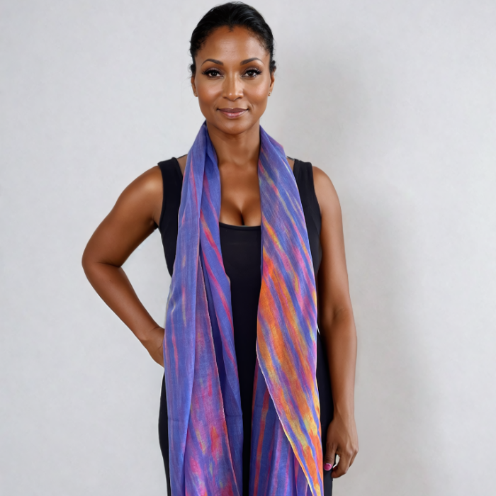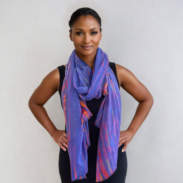 Introducing "River Colors," a 100% cashmere scarf that beautifully captures the serene flow of a river. The artist, Carolyn Marks Blackwood, has created a lined pattern in soft shades of purple and pink, bringing a gentle, calming feel to this lightweight scarf. Perfect for any season, "River Colors" adds a touch of elegance and tranquility to your everyday look.