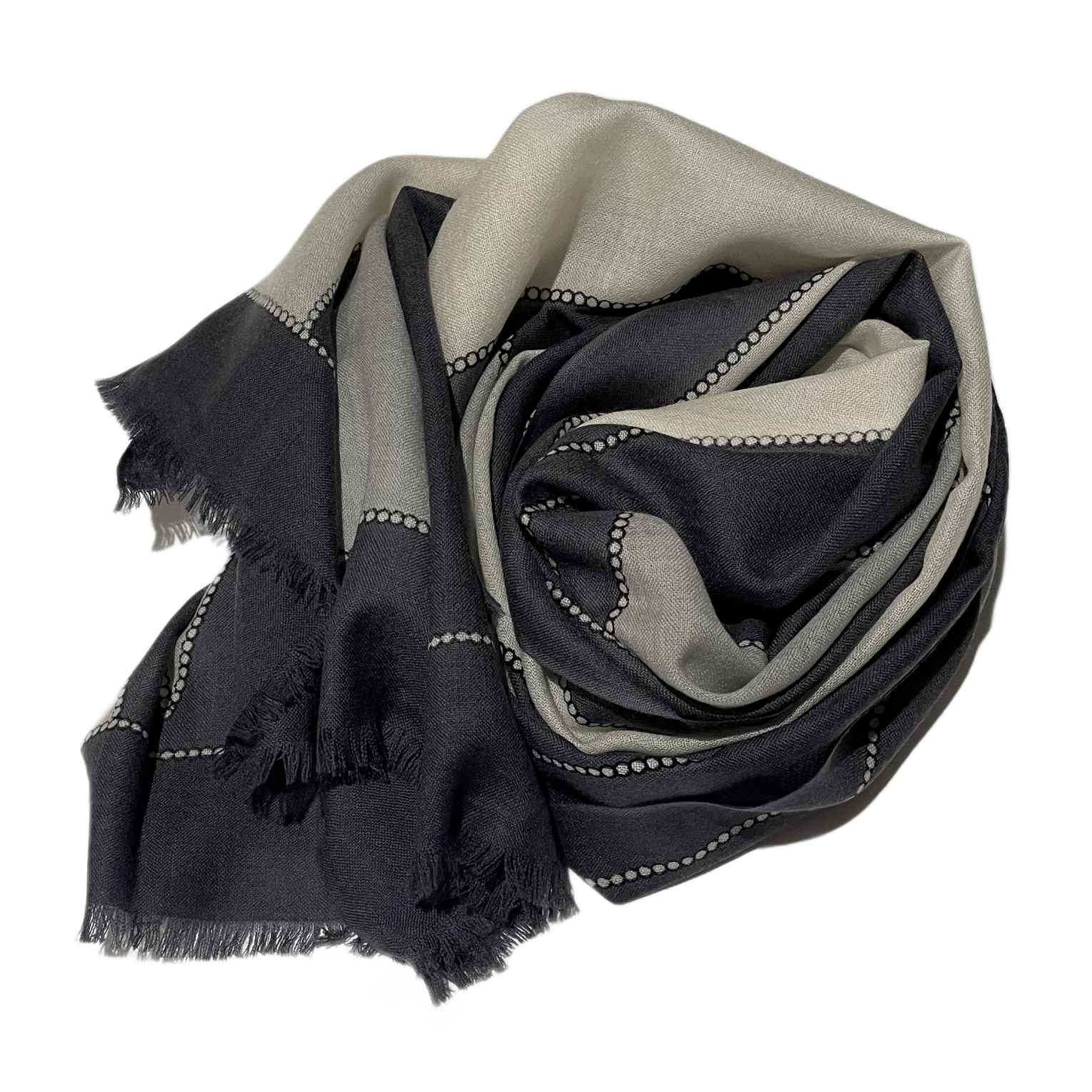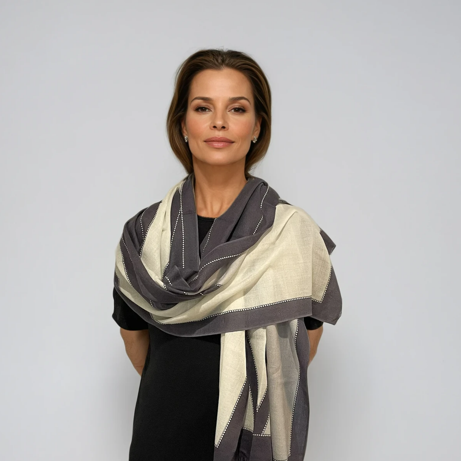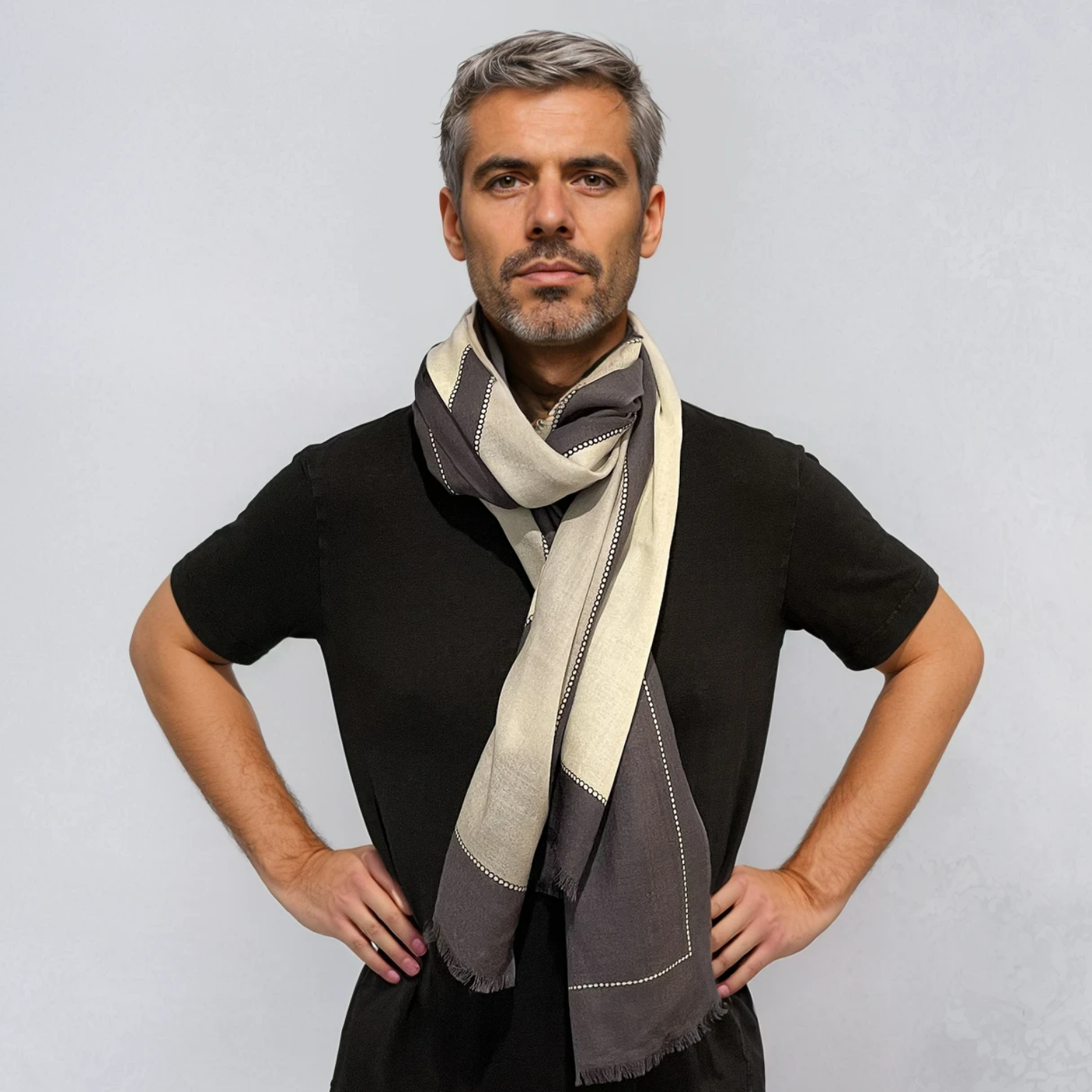 Vallis is a modern essential with a clean, geometric design. Made from 100% wool in a comfortable medium weight, this scarf offers warmth without feeling heavy. The pattern blends grey, white, and black into a balanced, versatile palette that works effortlessly across seasons.