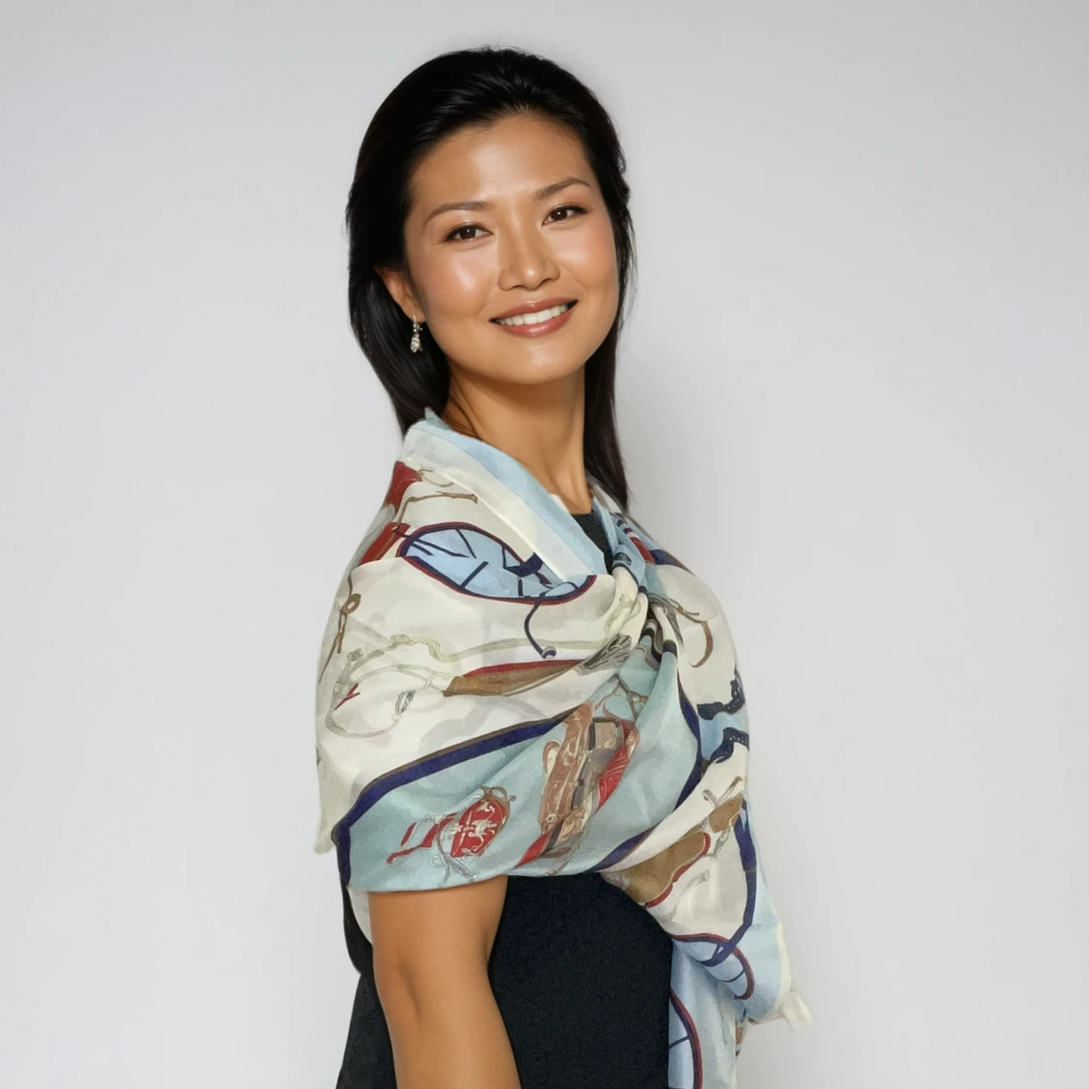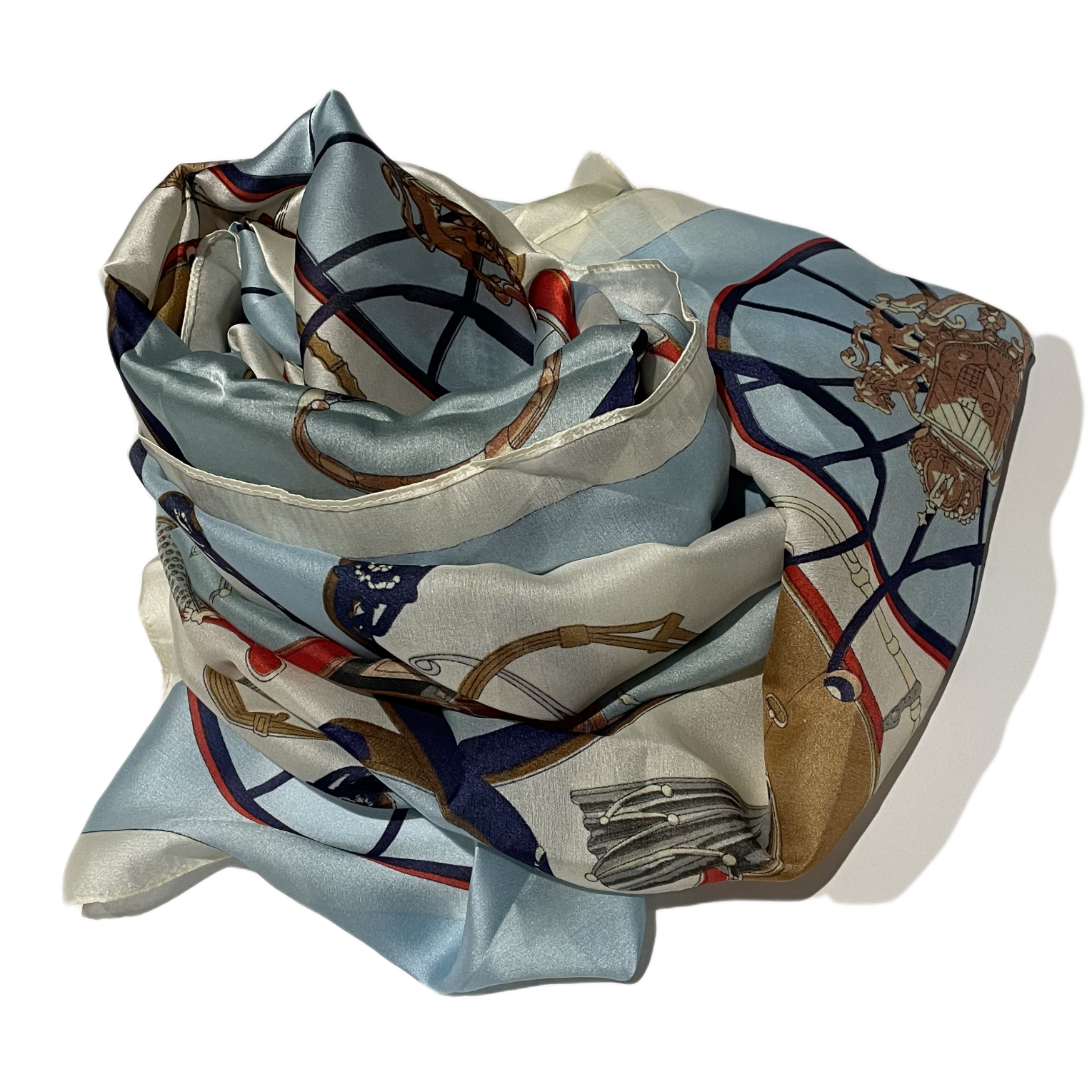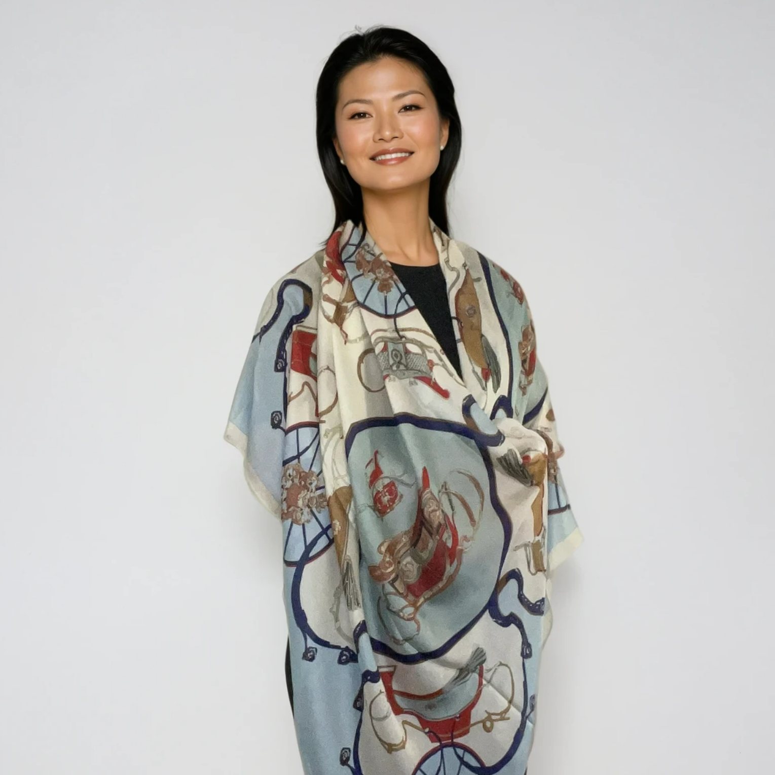 Willa is an elegant silk scarf inspired by the romance of classic European carriage scenes. Rendered in soft baby blue and white, the intricate horse carriage motif feels timeless and graceful, with a lightness that makes it effortless to wear.