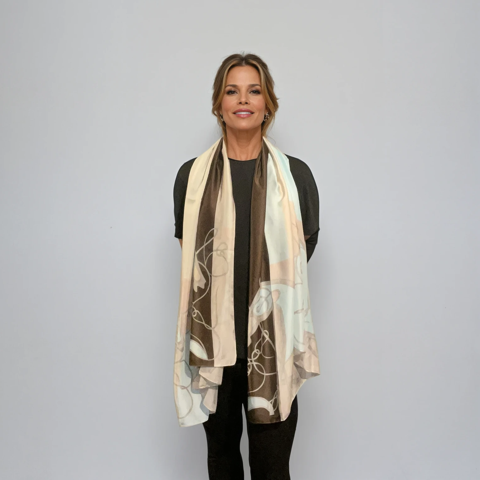 Zadie is a silk scarf that blends softness and style with quiet confidence. Delicate shades of pink and blue swirl with rich chocolate brown in a graceful, twisting strap pattern. Crafted from 100% silk, it drapes effortlessly and feels weightless against the skin. Whether tied at the neck, worn in the hair, or wrapped around the handle of a bag, Zadie adds an elegant finish to any look.